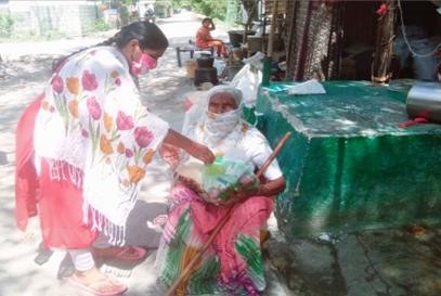 Anju, member of Help-desk, Gurjar Dharti distribution food at door step in settlement