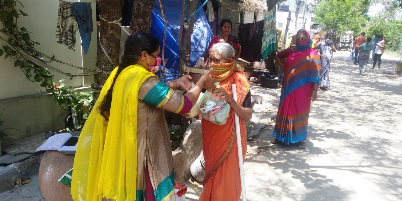 Baji Bee, distributing Dry ration in Arundhati Nagar Settlement to Elderly Woman