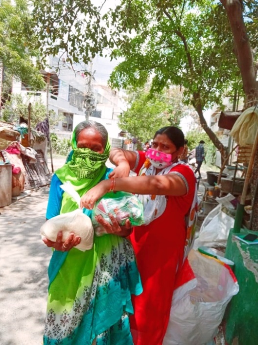 Distributing Dry ration in Ambedkar Nagar Settlement to Elderly Woman